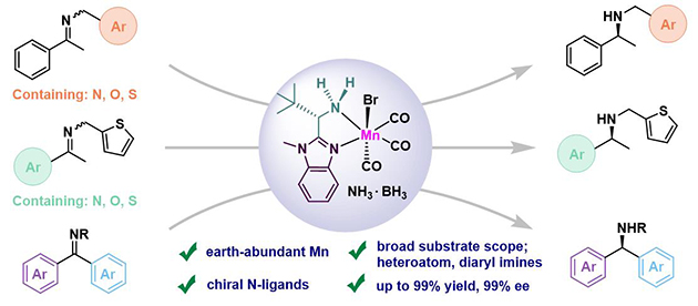 近日,中國(guó)科學(xué)院蘭州化學(xué)物理研究所低碳催化與二氧化碳利用全國(guó)重點(diǎn)實(shí)驗(yàn)室仿生催化與低碳化學(xué)組,在前期發(fā)展的錳催化不對(duì)稱轉(zhuǎn)移氫化反應(yīng)的基礎(chǔ)上 (ACS Catal.,2021,11,8033-8041;J. Catal.,2022,413,487-497;J. Catal.,2024,438,115680),在含雜原子(N,O,S)亞胺和雙芳基亞胺的不對(duì)稱轉(zhuǎn)移氫化反應(yīng)取得了新進(jìn)展。