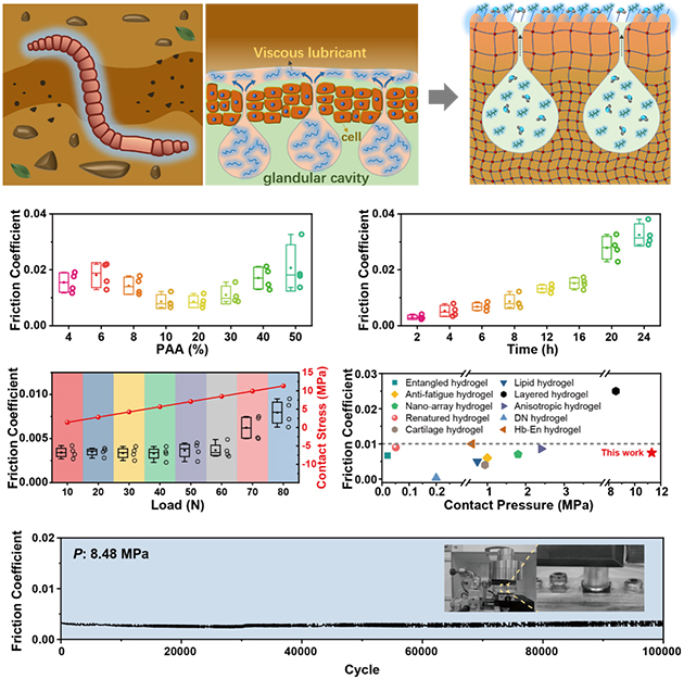 中國科學(xué)院蘭州化學(xué)物理研究所潤滑材料全國重點實驗室周峰研究員和麻拴紅研究員團隊,受自然界蚯蚓持續(xù)潤滑機制啟發(fā),開發(fā)了一種基于微量潤滑劑的聚合物凝膠超潤滑材料。