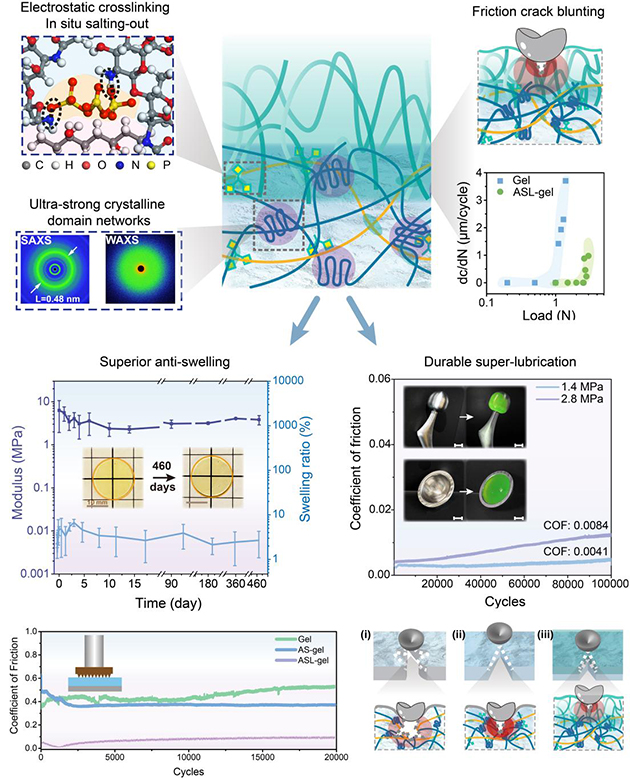在解決聚合物凝膠材料超高承載和機械魯棒性超潤滑難點基礎(chǔ)之上,研究人員將關(guān)注點轉(zhuǎn)移到解決材料在苛刻鹽離子介質(zhì)中的長效力學(xué)穩(wěn)定性難題。盡管已報道的大多數(shù)聚合物凝膠材料能夠?qū)崿F(xiàn)優(yōu)異的承載與減摩功能,但其在復(fù)雜離子介質(zhì)中普遍存在溶脹和力學(xué)失效問題,摩擦學(xué)評價往往以去離子水為潤滑介質(zhì),這明顯與聚合物材料的實際應(yīng)用工況不符(海水或生理介質(zhì)),使得相關(guān)材料的開發(fā)僅僅停留在概念和模型水平。