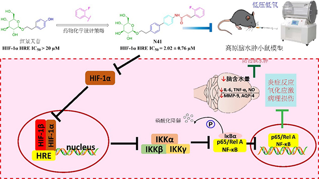 研究團(tuán)隊(duì)聚焦高原腦水腫防治重大問題,以高原特色中草藥紅景天中的活性成分紅景天苷為結(jié)構(gòu)基礎(chǔ),基于骨架躍遷和分子雜合的藥物設(shè)計策略,通過引入鄰氟苯基HIF-1α抑制劑藥效團(tuán),對紅景天苷的糖苷鍵、連接鏈、芳環(huán)取代基等三個部分進(jìn)行結(jié)構(gòu)修飾,設(shè)計并合成了多種紅景天苷衍生物開展構(gòu)效關(guān)系研究。通過雙熒光素酶報告基因、細(xì)胞毒、ELISA等實(shí)驗(yàn),篩選獲得強(qiáng)活性化合物N41,可顯著抑制HIF-1α HRE轉(zhuǎn)錄(IC50: 2.02 ± 0.76 μM),減少C8-D1A細(xì)胞炎癥因子IL-6和NO的表達(dá)以及ROS積累,減輕氧化損傷且無明顯細(xì)胞毒性。HACE小鼠模型研究發(fā)現(xiàn),N41可有效降低HACE模型小鼠腦含水量,改善缺氧導(dǎo)致的腦組織損傷,通過阻斷HIF-1α/IKKα/NF-κB信號通路,抑制下游TNF-α、IL-6等炎癥因子及MMP-9、AQP-4等血腦屏障通透性相關(guān)因子表達(dá),緩解炎癥反應(yīng)和維持血腦屏障完整性,發(fā)揮高原腦水腫防治功效。相關(guān)研究成果發(fā)表在European Journal of Medicinal Chemistry(2025,297: 117982)上。