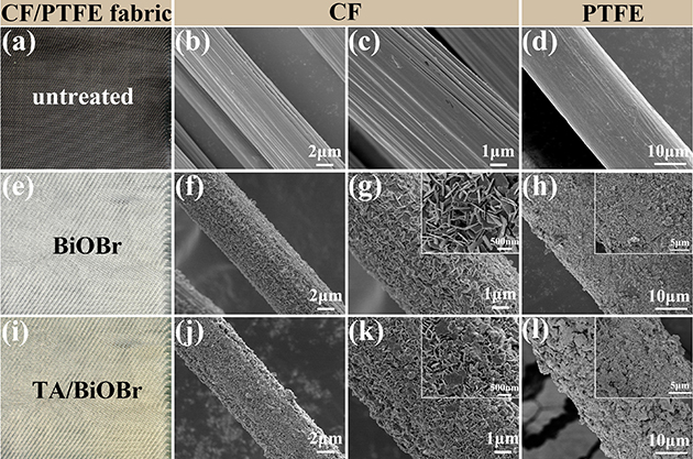 眾所周知,CF和PTFE纖維表面具有強(qiáng)化學(xué)惰性,導(dǎo)致其復(fù)合材料的界面結(jié)合性能差。在上述工作進(jìn)行摩擦學(xué)性能評(píng)價(jià)的過(guò)程中,存在大量纖維與樹(shù)脂基體脫黏拔出的現(xiàn)象,對(duì)復(fù)合材料的整體性能的發(fā)揮產(chǎn)生不利影響。近日,研究團(tuán)隊(duì)基于前期研究基礎(chǔ),在界面優(yōu)化改性方面提出了新思路。團(tuán)隊(duì)首次將BiOBr應(yīng)用于摩擦學(xué)領(lǐng)域,并提出了“軟-硬-軟”多級(jí)結(jié)構(gòu)的設(shè)計(jì)思路,通過(guò)化學(xué)浴、水熱生長(zhǎng)和層層自組裝方法在CF/PTFE織物表面依次構(gòu)建了化學(xué)交聯(lián)的“軟”基底層(PEI/PA)、垂直取向的“硬”中間層(BiOBr納米片)以及動(dòng)態(tài)配位的“軟”外層(TA/Fe3+金屬-多酚網(wǎng)絡(luò))。其改性前后的纖維表面形貌如圖1所示。