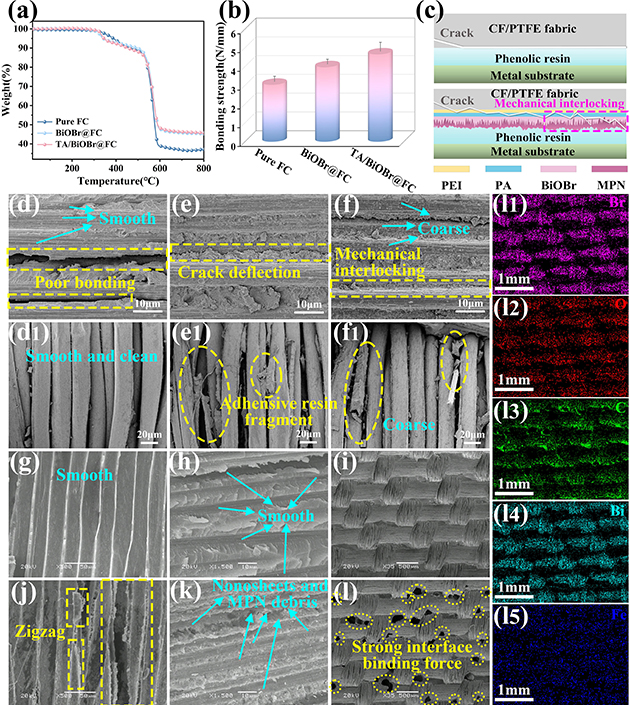 圖3.CF/PTFE纖維織物復(fù)合材料的TGA曲線(xiàn)(a)、粘結(jié)強(qiáng)度(b)和界面增強(qiáng)機(jī)理(c);純FC、BiOBr@FC和TA/BiOBr@FC剝離后織物截面上CF(d-f)和PTFE纖維(d1-f1)的SEM圖像;Pure FC(g-i)和TA/BiOBr@FC(j-l)剝離后金屬基板表面的SEM圖像;l的相應(yīng)元素映射(l1-l6)