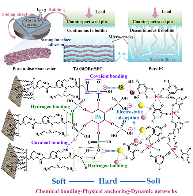 團(tuán)隊(duì)人員在此基礎(chǔ)上提出了在纖維織物表面構(gòu)建“軟-硬-軟”結(jié)構(gòu)增強(qiáng)復(fù)合材料的摩擦學(xué)性能的磨損機(jī)理。未經(jīng)改性的復(fù)合材料在受到外部擠壓和剪切力的作用下,出現(xiàn)大量的微裂紋并伴隨纖維嚴(yán)重拔出斷裂,隨后在對(duì)偶表面形成不均勻不連續(xù)的摩擦膜。而TA/BiOBr@FC經(jīng)由表界面改性,織物界面從微觀到宏觀形成了化學(xué)鍵合-物理錨定-動(dòng)態(tài)網(wǎng)絡(luò)的多級(jí)增強(qiáng)體系,避免纖維-樹(shù)脂界面脫黏和纖維拔出,顯著提升了CF/PTFE纖維織物復(fù)合材料的界面性能和摩擦學(xué)性能。