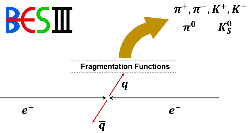 標(biāo)準(zhǔn)模型的量子色動(dòng)力學(xué)(QCD)是描述部分子(夸克和膠子)間強(qiáng)相互作用的理論,它的最大挑戰(zhàn)來自于低能區(qū)的非微擾性質(zhì)。由于色禁閉效應(yīng),實(shí)驗(yàn)上無法直接觀測(cè)到帶色荷的部分子,只能探測(cè)色中性的強(qiáng)子。碎裂函數(shù)描述了部分子的強(qiáng)子化過程,對(duì)其研究是理解強(qiáng)子產(chǎn)生機(jī)制的重要手段。正負(fù)電子對(duì)撞中單舉強(qiáng)子的產(chǎn)生被認(rèn)為是研究碎裂函數(shù)最有效的過程之一(如圖1所示)。目前,在質(zhì)心能量低于10 GeV的區(qū)域,能用于碎裂函數(shù)研究的高精度正負(fù)電子對(duì)撞實(shí)驗(yàn)數(shù)據(jù)極為有限。