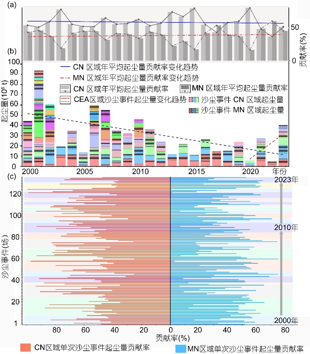 2000-2023年東亞中部地區(qū)中國北方與蒙古國大規(guī)模沙塵事件起塵量及貢獻(xiàn)率變化