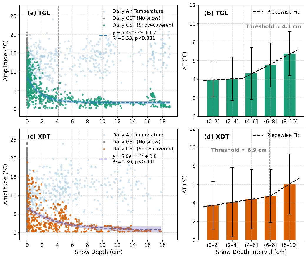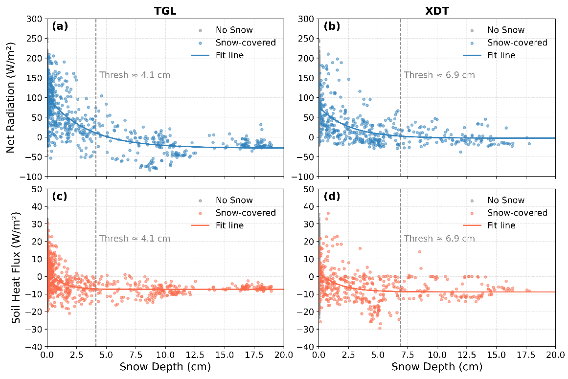 研究發(fā)現(xiàn),當(dāng)雪深超過4.1 cm(唐古拉)與6.9 cm(西大灘)時,地表溫度振幅顯著收斂、保溫效應(yīng)確立;而在<2 cm的淺雪條件下,強反照率與融雪潛熱耗散導(dǎo)致地表冷卻強化。同時,地表凈輻射與土壤熱通量隨雪深呈非線性衰減并趨穩(wěn)。