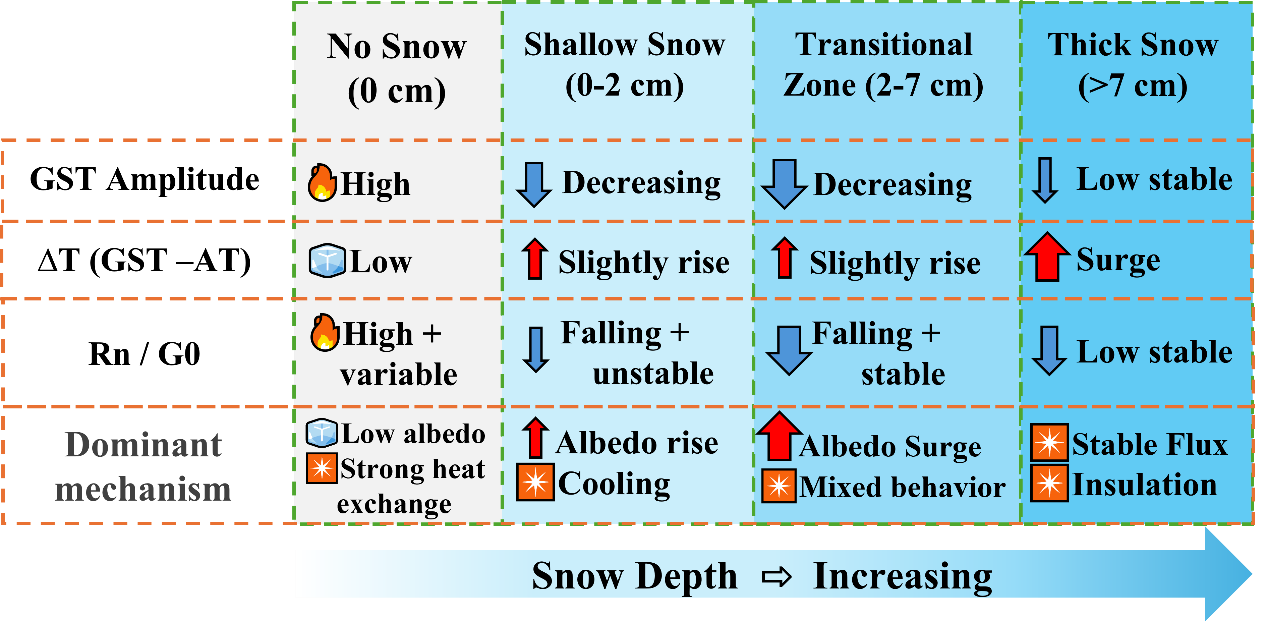 據(jù)此研究提出了“四區(qū)間機制框架”,即裸地—薄雪(0–2 cm)—過渡雪(2–7 cm)—厚雪(>7 cm)。該框架刻畫了從強地–氣耦合的冷卻階段,跨越閾值進入穩(wěn)定保溫階段的演變路徑,為淺雪主導(dǎo)區(qū)的雪–地相互作用提供了可操作的判據(jù)與參數(shù)化思路。