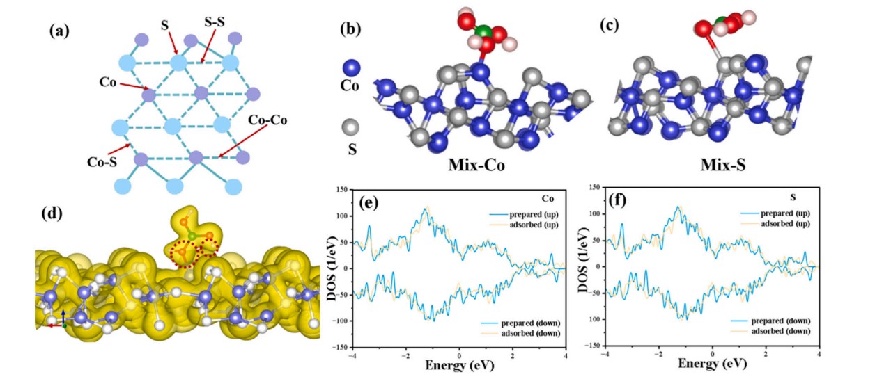 圖2.(a)ZIF-67衍生Co3S4中空吸附劑的吸附位點示意圖;(b-c)H3BO3在Co?S?上最穩(wěn)定的結(jié)構(gòu)(Co和S位點);(e,f)不同位點Co?S?吸附H3BO3的DOS圖。
