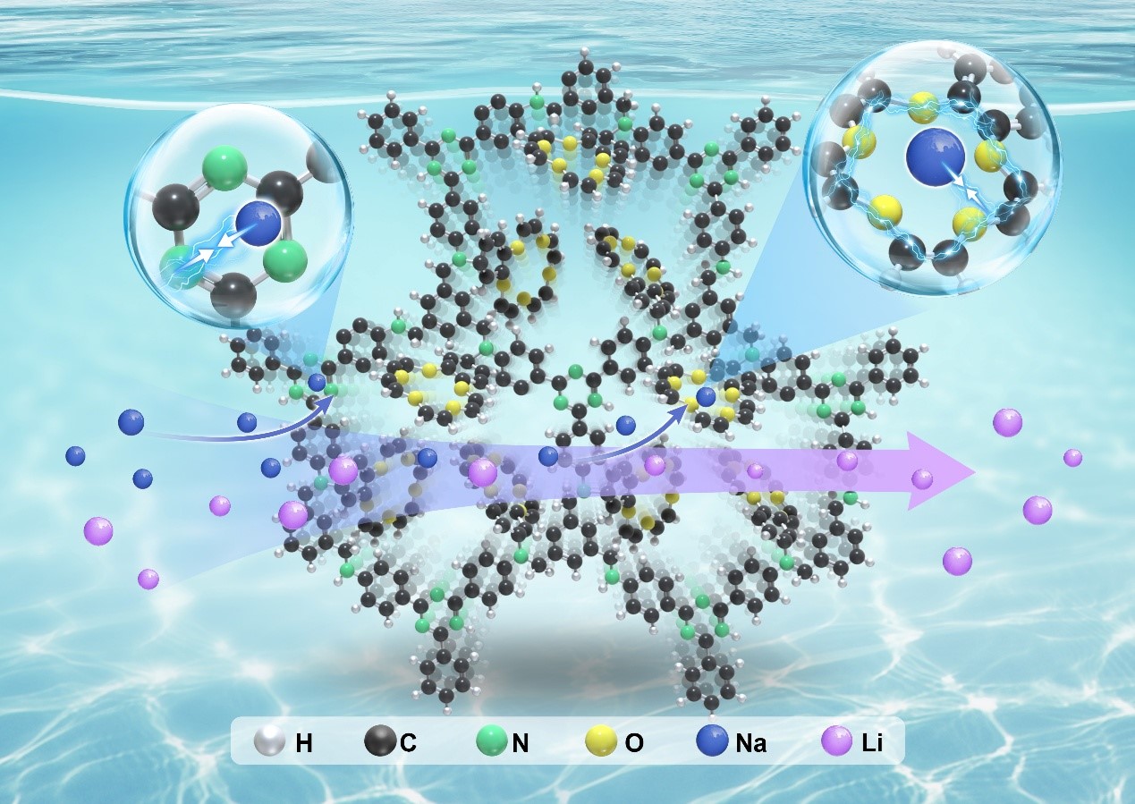 近日,青海鹽湖所膜分離提鋰技術(shù)與應(yīng)用團(tuán)隊(duì)和電化學(xué)分離技術(shù)團(tuán)隊(duì)在Chemical Engineering Journal期刊上發(fā)表題為“Synergy of framework dynamics and crown ether chemistry in covalent organic frameworks for Na+ capture(共價(jià)有機(jī)框架中框架動(dòng)力學(xué)與冠醚化學(xué)的協(xié)同效應(yīng)助力鈉離子捕獲)”的研究進(jìn)展,青海鹽湖所博士生何小祥為論文第一作者,膜分離提鋰技術(shù)與應(yīng)用團(tuán)隊(duì)的朱朝梁副研究員、徐國(guó)旺博士和電化學(xué)分離技術(shù)團(tuán)隊(duì)的高丹丹研究員為共同通訊作者。在這項(xiàng)工作中,科研人員開(kāi)發(fā)了一種新的柔性COFs的合成策略,在水溶液中通邊攪拌單體90分鐘內(nèi)合成了ISL-COF-1和ISL-COF-2,并通過(guò)后合成修飾柔性COFs制備了4-溴苯并-15-冠-5功能化的COFs(ISL-COF-1CE/2CE)。表征結(jié)果表明,修飾后的COFs在保持高結(jié)晶度的同時(shí),實(shí)現(xiàn)了15C5的有效固定。其中,ISL-COF-1CE展現(xiàn)出顯著的Na?吸附性能(63.7 mg/g),優(yōu)異的選擇性吸附(Na?:41.4 mg/g vs Li?:5.8 mg/g)和循環(huán)穩(wěn)定性(10次循環(huán)后效率>90%),證明了在Na?吸附方面的卓越性能。動(dòng)力學(xué)和熱力學(xué)分析表明,吸附過(guò)程符合偽二階模型和朗格繆爾等溫線,且為吸熱自發(fā)反應(yīng)。DFT計(jì)算揭示冠醚位點(diǎn)為主要結(jié)合位點(diǎn),其次為三嗪N,而C–NH基團(tuán)作用較弱。實(shí)驗(yàn)分析和理論計(jì)算表明,ISL-COF-1CE在Na?吸附方面的卓越性能源于冠醚配位、柔性框架、靜電相互作用與親水性增強(qiáng)的協(xié)同效應(yīng)。該研究不僅闡明了冠醚-COFs中主-客體的相互作用機(jī)制,還為開(kāi)發(fā)高效離子分離吸附劑提供了新策略。