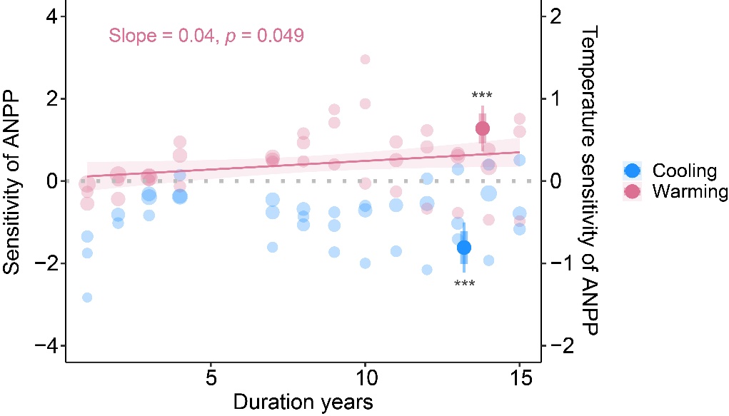 圖2 地上凈初級生產(chǎn)力對長期增溫和降溫的響應