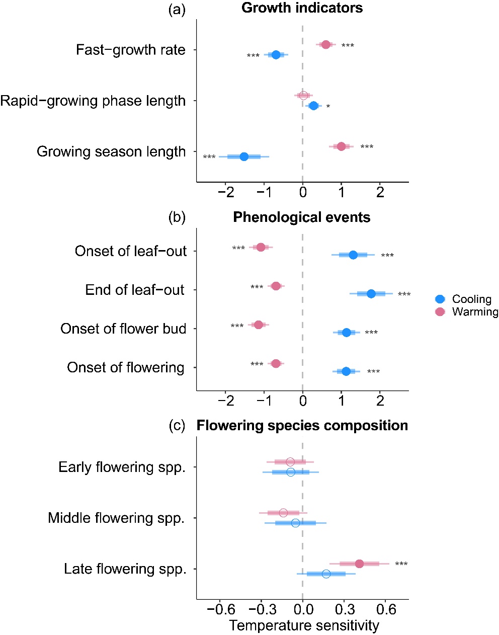 圖3 增溫和降溫下生長指標、物候事件及開花物種組成的溫度敏感性