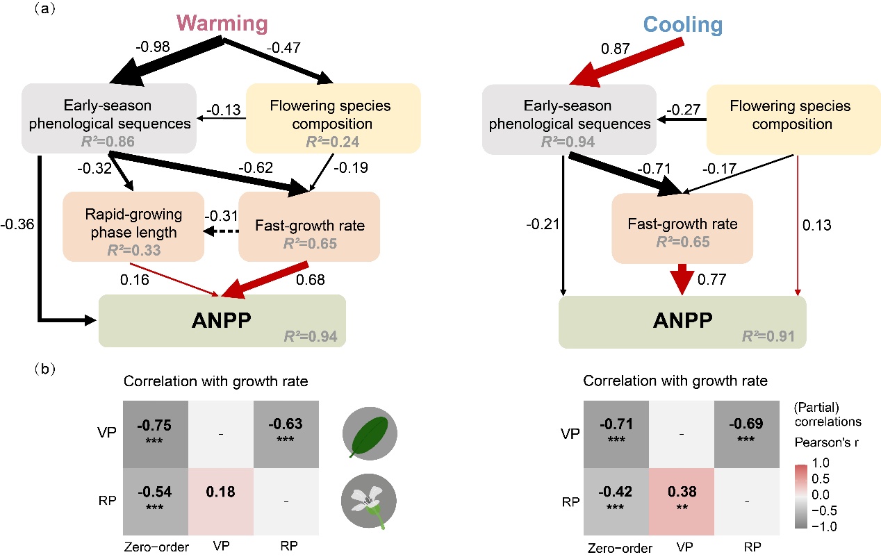 研究結果表明,在15年增溫處理下,ANPP顯著增加,而在降溫處理下降低。值得注意的是,增溫對ANPP的促進效應隨時間推移逐漸增強,而降溫的抑制效應則未表現(xiàn)出顯著的時間依賴性。重要的是,生長季早期物候影響了ANPP對增溫和降溫的響應。關鍵發(fā)現(xiàn)在于,生長季早期的物候變化在調節(jié)ANPP對溫度變化的響應中發(fā)揮重要作用。具體而言,增溫條件下ANPP的增加與植物返青期提前及生長速率加快密切相關;而在降溫條件下,葉片與開花物候對植物生長表現(xiàn)出解耦的級聯(lián)效應:返青期提前反而抑制了植物后續(xù)生長,而開花期推遲則部分抵消了前期的不利影響。