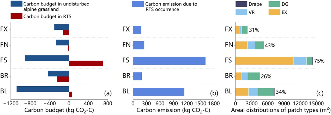 青藏高原是全球最大的高海拔多年凍土區(qū),儲存著大量土壤有機碳。近年來,隨著氣候變暖、多年凍土廣泛退化,熱融滑塌、熱融溝和熱融湖塘等反映多年凍土快速融化現(xiàn)象的熱喀斯特地貌廣泛發(fā)育,其對高寒生態(tài)系統(tǒng)碳循環(huán)和氣候反饋的影響備受關注。然而,與熱融溝和熱融湖塘相比,無論是青藏高原還是環(huán)北極多年凍土區(qū),熱融滑塌(retrogressive thaw slumps,RTS)對凍土生態(tài)系統(tǒng)碳動態(tài)的影響都缺乏系統(tǒng)性研究。