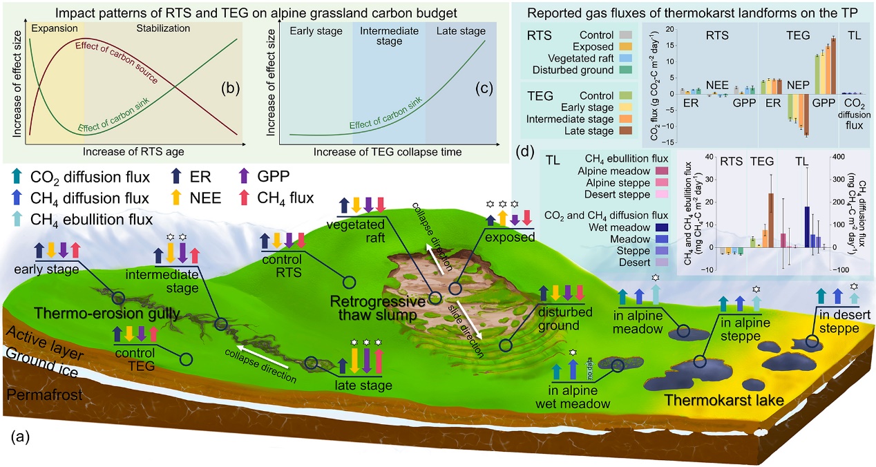 中國科學院西北生態(tài)環(huán)境資源研究院冰凍圈科學與凍土工程全國重點實驗室研究團隊聯(lián)合蘭州大學、丹麥哥本哈根大學以及中國科學院植物研究所,于2024和2025年在青藏高原腹地開展系統(tǒng)性溫室氣體通量觀測,量化了熱融滑塌所導致的通量變化以及研究區(qū)域的碳收支平衡,為評估氣候變化背景下青藏高原多年凍土碳反饋提供了關鍵證據(jù)。