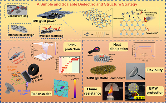 隨著電子設(shè)備向微型化、高集成化、高功率化和高頻化方向發(fā)展,熱量積聚與電磁波干擾問題日益嚴重。同時,由于封裝空間極其受限,系統(tǒng)內(nèi)部往往難以預(yù)留足夠的空間用于獨立安裝散熱或電磁波防護組件,這不僅限制了信號傳輸?shù)姆€(wěn)定性,更嚴重威脅電子設(shè)備的服役壽命。傳統(tǒng)的方法通常是同時引入兩種填料來實現(xiàn)雙重功能,但不同功能填料間可能存在阻抗失配或熱傳遞受阻等協(xié)同性問題而存在顯著局限性。因此,開發(fā)兼具高效熱管理、吸波/電磁屏蔽性能的封裝防護材料具有極其重要的意義。