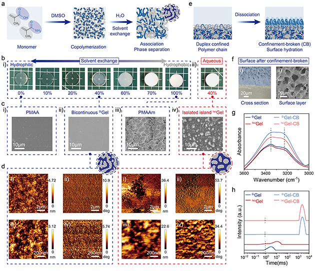 圖2. (a) 通過(guò)溶劑交換策略制備結(jié)構(gòu)可調(diào)線性共聚物水凝膠網(wǎng)絡(luò)的示意圖。(b) 不同MAAm含量(摩爾分?jǐn)?shù))水凝膠的宏觀光學(xué)照片。(c) 不同水凝膠的掃描電鏡圖像。(d)BiGel和IsoGel的原子力顯微鏡高度圖與相圖。(e) 表面限域破壞處理形成潤(rùn)滑層的示意圖。(f)?BiGel-CB截面掃描電鏡圖像,顯示梯度結(jié)構(gòu)。(g)?BiGel、IsoGel及其限域破壞后樣品表面的ATR-FTIR光譜。(h) 不同水凝膠的LF-NMR T?弛豫時(shí)間分布。