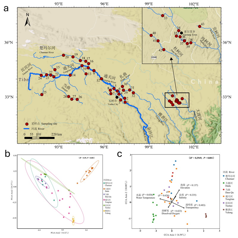 a 青藏高原長江源區(qū)調(diào)查采樣點(diǎn)示意圖;b 長江源區(qū)各水系魚類群落主坐標(biāo)分析圖;c 長江源區(qū)各水系魚類群落典范對應(yīng)分析圖