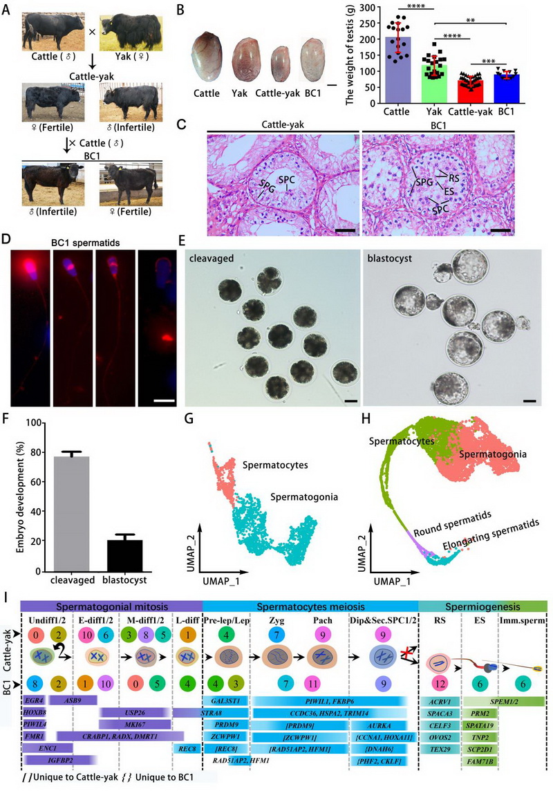 論文代表圖1:普通牛和牦牛雜交后代和回交睪丸組織單細胞圖譜分析。A) 普通牛與牦牛雜交產(chǎn)生犏牛及其回交后代(BC1)的模型示意圖。B) 牦牛、家牛、犏牛及BC1的睪丸重量對比,比例尺 = 2 厘米;普通牛(n = 18)、牦牛(n = 21)、犏牛(n = 37)和BC1(n = 13)的睪丸重量進行兩兩比較。C) 犏牛(左)和BC1(右)睪丸組織的蘇木精-伊紅(H&E)染色切片。比例尺 = 50 μm。在犏牛中未觀察到精母細胞階段以后的生精細胞,而與犏牛相比,BC1的生精缺陷有所緩解。SPG:精原細胞,SPC:精母細胞,RS:圓形精子細胞,ES:伸長精子細胞。D) 從BC1睪丸中分離出的精子細胞頂體染色。比例尺 = 10 μm。E & F) BC1精子細胞胞質內(nèi)注射入牦牛卵母細胞后獲得了部分卵裂期胚胎和囊胚期胚胎;比例尺 = 50 μm。G) 犏牛生殖細胞的UMAP標注圖,僅識別出兩種亞型:精原細胞和精母細胞。H) BC1生殖細胞的UMAP標注圖,識別出精原細胞、精母細胞、圓形精子細胞和伸長精子細胞。I) 犏牛和BC1生殖細胞各簇中特定標記基因的表達情況,可用于細胞類型鑒定。