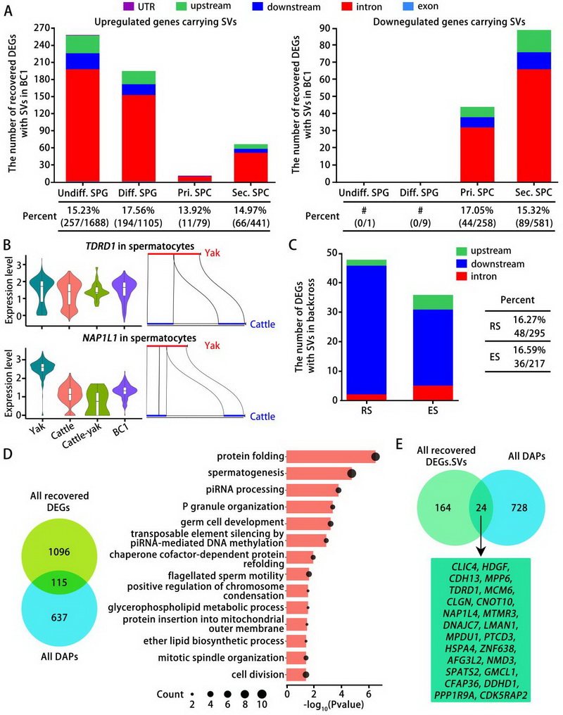 論文代表圖2:普通牛、牦牛、犏牛及BC1各類生殖細胞亞型中攜帶基因組結構變異的差異表達基因。A) 柱狀圖顯示在犏牛精原細胞和精母細胞各亞群中,具有結構變異且表達上調或下調、但在BC1中表達得以恢復的基因數(shù)量。B) 代表性基因的小提琴圖及其結構變異的示意圖。C) 柱狀圖顯示與牦牛和普通牛相比,在BC1各類精子細胞亞型中攜帶基因組結構變異的差異表達基因數(shù)量。D) 對BC1精母細胞中所有表達水平恢復的差異表達基因,與犏牛精母細胞中的差異豐度蛋白進行韋恩圖分析及GO富集分析。E) BC1精母細胞中所有表達恢復的差異表達基因、具有結構變異的差異表達基因,以及犏牛精母細胞中所有差異豐度蛋白的韋恩圖分析。