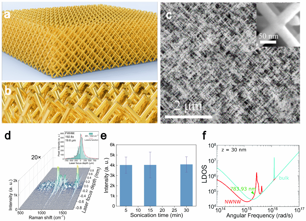 圖:具有聚焦容忍性和結(jié)構(gòu)穩(wěn)定性的三維金納米網(wǎng)格SERS襯底:a-b基于離子徑跡技術(shù)制備的三維金納米線(xiàn)網(wǎng)格模型;c金納米線(xiàn)網(wǎng)格實(shí)物的掃描電鏡照片,納米線(xiàn)直徑為35 nm;d 三維襯底在20倍物鏡下能夠在離焦范圍192.8±19.6 μm內(nèi)保持50%的SERS信號(hào);e 超聲水應(yīng)力環(huán)境SERS穩(wěn)定性測(cè)試,在30分鐘超聲后仍能保持信號(hào)穩(wěn)定;f 有效介質(zhì)模型反映出納米線(xiàn)網(wǎng)格結(jié)構(gòu)在激發(fā)光附近的高局域態(tài)密度。
