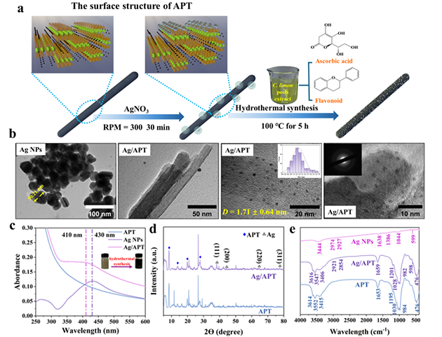 研究人員采用檸檬皮提取物介導(dǎo)的低溫水熱法,利用所含抗壞血酸與多酚類物質(zhì)將Ag+還原為Ag0,并原位均勻錨定于凹凸棒石納米棒晶表面,構(gòu)筑了銀納米粒子尺寸小于2 nm的Ag/凹凸棒石復(fù)合納米酶(Ag/APT)(圖1)。該礦物復(fù)合納米酶比AgNPs具有更大的比表面積和更多的活性位點(diǎn)。對(duì)多重耐藥菌性耐甲氧西林金黃色葡萄球菌(MRSA)和產(chǎn)超廣譜β-內(nèi)酰胺酶大腸桿菌(ESBLs-E.coli)均表現(xiàn)出優(yōu)異的廣譜抗菌活性。