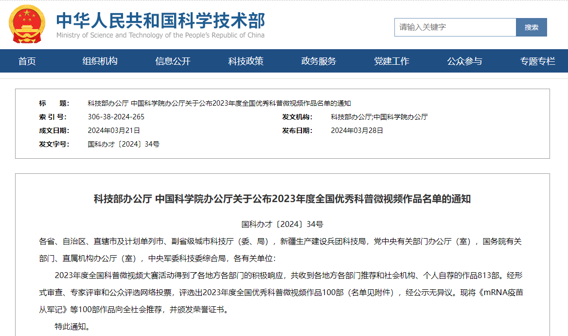 據(jù)悉,2023年度全國(guó)科普微視頻大賽共收到各地方各部門推薦和社會(huì)機(jī)構(gòu)、個(gè)人自薦的作品813部,經(jīng)形式審查、專家評(píng)審和公眾評(píng)選網(wǎng)絡(luò)投票,評(píng)選出2023年度全國(guó)優(yōu)秀科普微視頻作品100部。