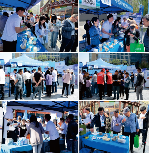活動(dòng)現(xiàn)場(chǎng),28家單位聯(lián)動(dòng)開展多種類、多元化科普宣傳內(nèi)容,科技感十足的機(jī)器人、航天器模型和多種科研儀器吸引著眾多參展觀眾的目光。依托青海鹽湖所成立的青海省鹽湖地質(zhì)與環(huán)境科研科普基地,通過詳細(xì)策劃和充分動(dòng)員年輕科研骨干,精心準(zhǔn)備了“青藏高原鹽湖演化、鹽湖成鹽成礦過程、微觀世界中的鹽湖、鹽湖資源高效利用、鹽湖旅游資源、鹽湖與人類生活和最美鹽湖人”等七個(gè)宣傳板塊,全面展示了鹽湖科普知識(shí)。展臺(tái)前觀眾絡(luò)繹不絕,成為本次活動(dòng)人氣最旺的展臺(tái)之一。不同年齡段、不同行業(yè)的參觀群眾通過“看展板、聽講解、摸標(biāo)本”了解和學(xué)習(xí)鹽湖科普知識(shí),并積極參與“鹽湖知識(shí)答題”環(huán)節(jié)。兩個(gè)小時(shí)的活動(dòng)中共有154人參與掃碼答題互動(dòng),觀眾們不僅獲得了小獎(jiǎng)品,也在參觀答題過程中學(xué)習(xí)了鹽湖知識(shí),感受了鹽湖的神奇與美麗。