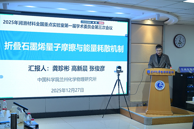 蘭州化物所所長、實驗室主任周峰研究員作了2025年度工作報告,全面梳理科研成果、平臺建設(shè)、人才引育、產(chǎn)業(yè)化等領(lǐng)域的成效,深入剖析現(xiàn)存問題與改進思路,明確2026年工作重點與核心發(fā)展目標。蔡美榮研究員、鮑路瑤副研究員、龔珍彬副研究員分別作了“固/介質(zhì)復合潤滑材料的空間環(huán)境效應(yīng)及在軌驗證研究”“潤滑油材料的高通量計算和人工智能設(shè)計”“折疊石墨烯量子摩擦與能量耗散機制”的學術(shù)報告。